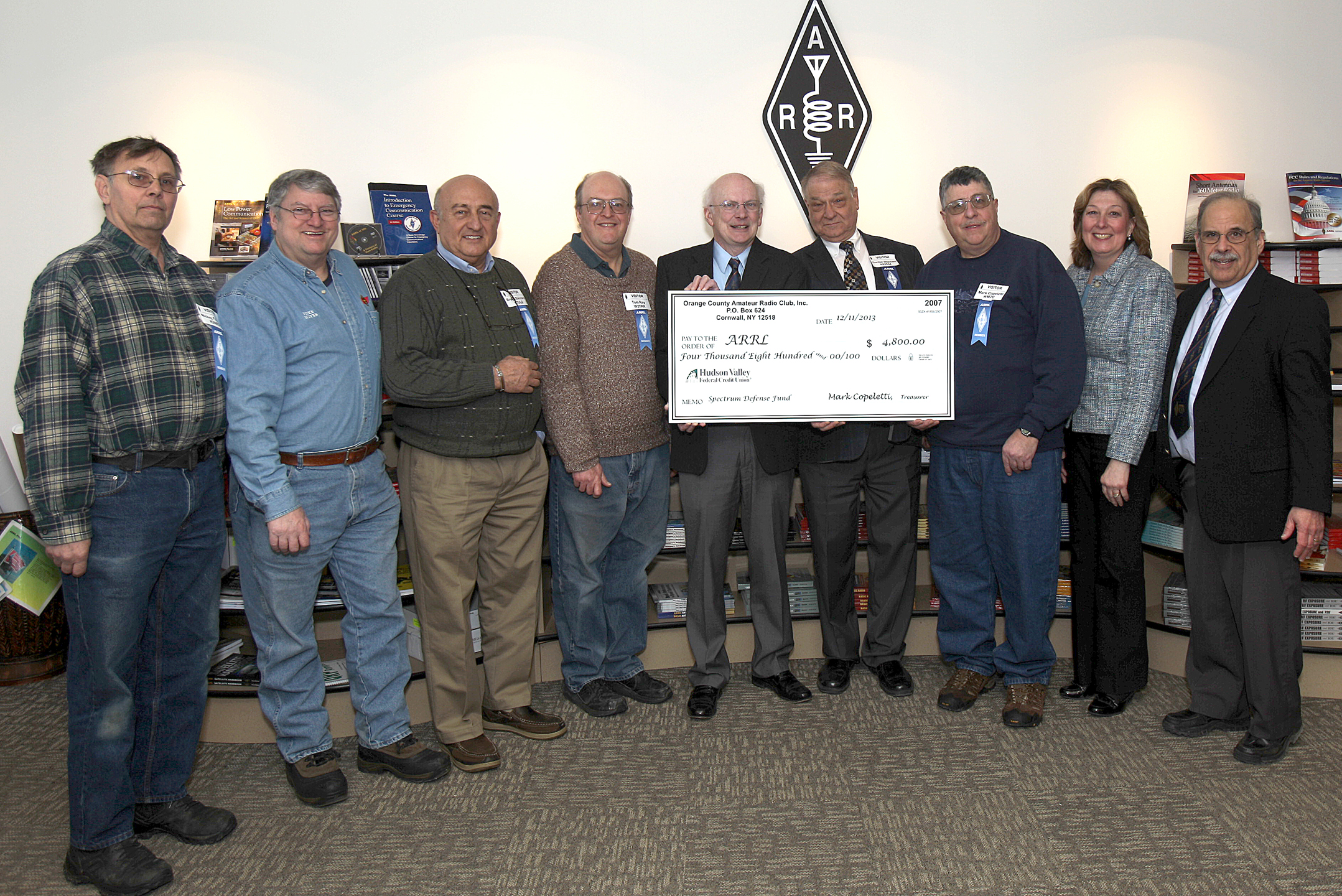 Proceeds from the 2013 ARRL Hudson Division Awards Banquet last fall have been donated to the ARRL Spectrum Defense Fund by banquet sponsor, the Orange County Amateur Radio Club (OCARC) The donation totaled nearly $5000, a record for the Division. Nearly 170 attended. Awards for 2012 and 2013 were presented, since the 2012 banquet had to be called off due to Hurricane Sandy.