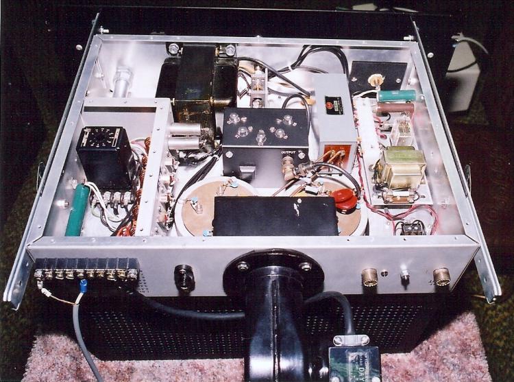 I mounted the filament transformer, an impressive hunk of metal, under the chassis. The filament choke had gone from two short ferrite rods to a B&W FC-30A, which is about 4 times bigger. A wind box was added to provide air distribution to the Eimac aluminum air sockets. A compartment was added to house the RF filters for all ac and control wiring, and a box was added to house the input tuned circuits.