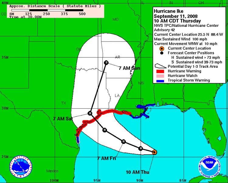 At 11 AM (EDT) Thursday, the National Hurricane Center (NHC) reported that Ike was heading toward the Northwestern Gulf of Mexico, moving west-northwest near 10 MPH in a motion that should continue over the Central and Western Gulf of Mexico on Thursday and Friday. With top sustained winds near 100 mph, Ike is about 580 miles east of Corpus Christi, Texas, and 470 miles east-southeast of Galveston. Hurricane-force winds extended outward up to 115 miles from the center and tropical storm-force winds extended outward up to 275 miles.