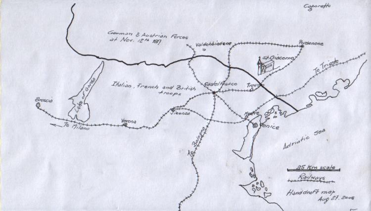 During the night of February 2 Bortolo parachutes into S Fior (a town near St Giacomo), landing in an estate belonging to his family. He is helped by peasants to conceal the parachute and his uniform. (It was one of the first uses of the device designed by Leonardo da Vinci in 1500. It was rediscovered by the British and later improved by General Guidoni who died during a launch test over the airport of the town that now bears his name -- Guidonia Montecelio, near Rome.)
