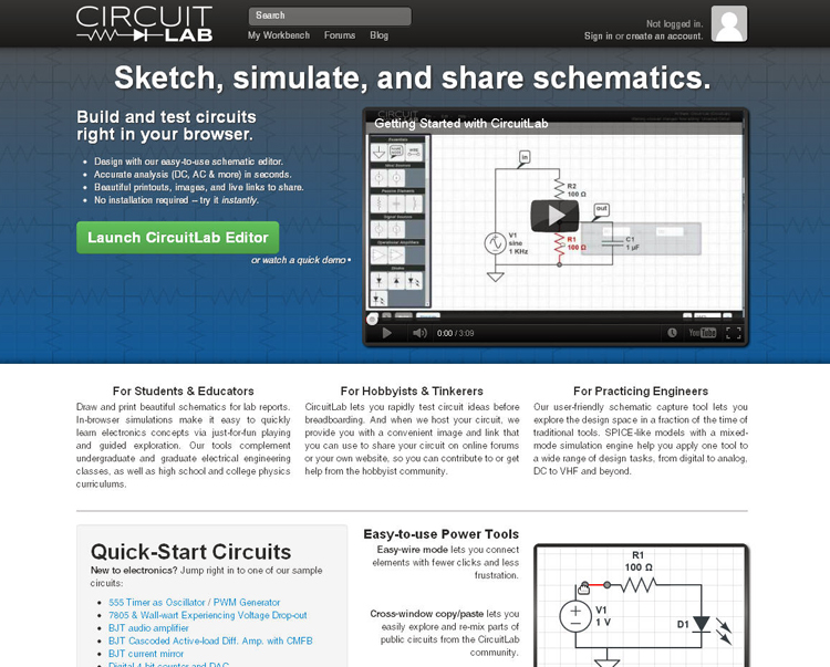 If you tinker with electronic circuit designs, you will be interested in a new free online application for designing, testing, editing, and sharing electronic circuits: CircuitLab Editor. Intended for students, educators and engineers, as well as hobbyists, this online application lets you quickly test your circuit designs before breadboarding.