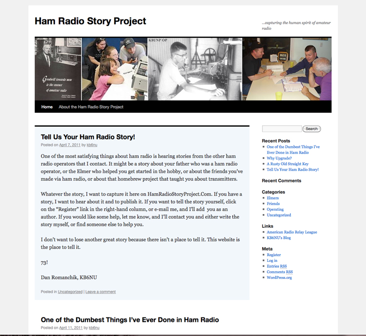 Dan Romanchik, KB6NU -- of KB6NU.com fame -- has started a new website called the Ham Radio Story Project. The goal of his new site is to capture the human spirit of ham radio by collecting stories from hams around the world -- personal stories of how ham radio has touched lives, either the lives of ham radio operators themselves, or of the people who hams serve.