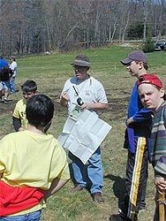 I started to develop a story line that would tie in to scouting to get the interest going. I pulled out my fox hunting gear, hung the compass around my neck, map and HT in hand (see above). It was a quick attraction. As the groups of scouts arrived I handed one of the scouts the custom antenna with a FoxFinder (see QST April 2001) attached, and started the talk with how fox hunting was like Orienteering having map and compass work with the added difficulty that you didn't know were the end point was. Since the FoxFinder is an audio signal strength indicator it was easy for the kids to swing the antenna and hear the signal change without a lot of tutoring. With one or two sweeps of the antenna virtually all of them could give a good direction. Quickly taking turns with the one-minute cycle we projected virtual bearings into the trees.