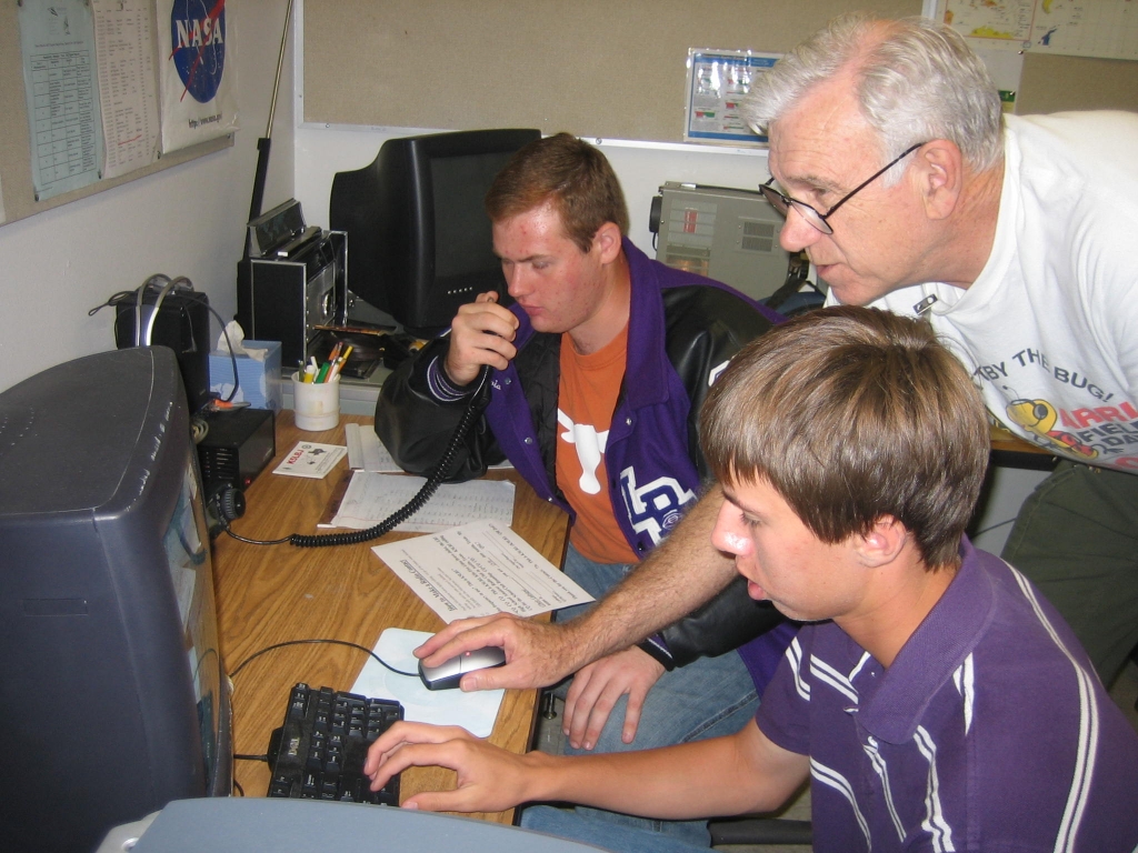 Feb. 2010- "Finally the weather broke and success! A big thumbs up from both KI4RDT and KJ4LIV from EM77 for successful QSOs with YV5DSL in FK60nk Caracas, Venezuela off satellite HO-68. It was a lower pass but was successful which makes it all the sweeter. Pictures are from my Cisco Internetworking class including KJ4LIV, KJ4LIU, KJ4PIY and Chris Brown HVAC instructor assisting. Also pictured is Charlie Cantrill (KI4RDT) instructing TC (KJ4LIV) in use of satellite ops. Next time we hope to hook up the TNC to get telemetry."